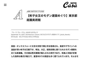 「【彬子女王のモダン建築めぐり】東京都庭園美術館」という彬子女王が連載するモダン建築めぐり 第2回「東京都庭園美術館」の記事が、カーサ ブルータスに掲載されています。