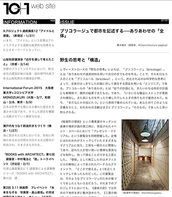橋本健史氏(建築家、403architecture [dajiba])による「ブリコラージュで都市を記述する──ありあわせの「全体」」という記事が、10+1 web siteに掲載されています。