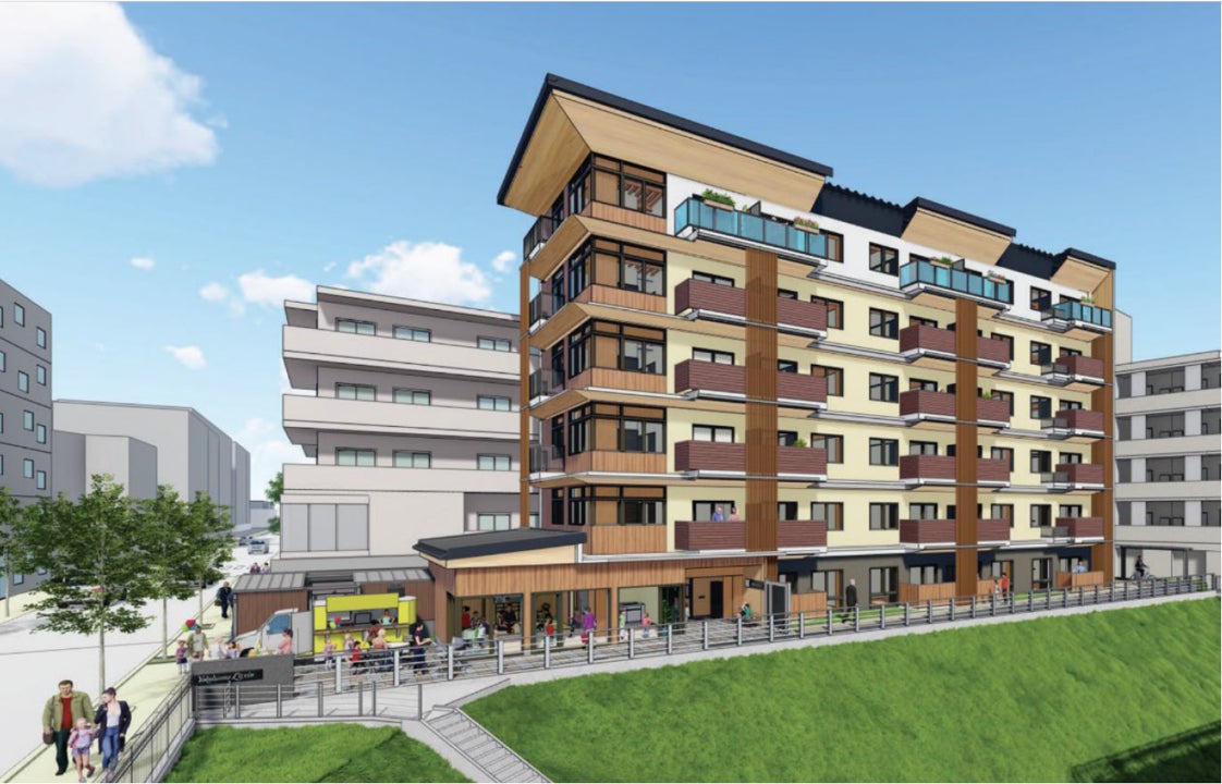 建設地は東急田園都市線・市が尾駅徒歩3分の駅前広場に面し、木質感を活かした外観デザインが計画されている。ZEH-M Oriented水準の断熱性能と太陽光パネルの設置により、脱炭素社会への転換を象徴する建築として位置づけられる。低層部には多目的スペースを設け、地域の子育て支援やコミュニティ形成にも資する構成が意図されている。