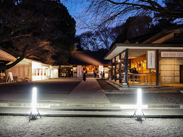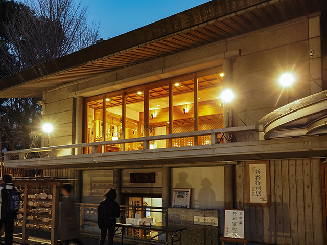 開門時間の17時ぎりぎりだったので(乃木神社の開門時間は午前6時から午後5時)、日没時間が過ぎていたこともあり、あたりは暗くなりだしていて、なかなか珍しいライトアップされた社殿の風景が見られましたね。