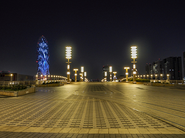 観覧車のライトアップ具合と真っ暗なメガウェブ(写真では明るめに写ってますけど、これは補正効果です。笑)と手前の駐車場などがあったあたりに資材がたくさん置かれている風景をみるとぐっとくるものがありましたね。