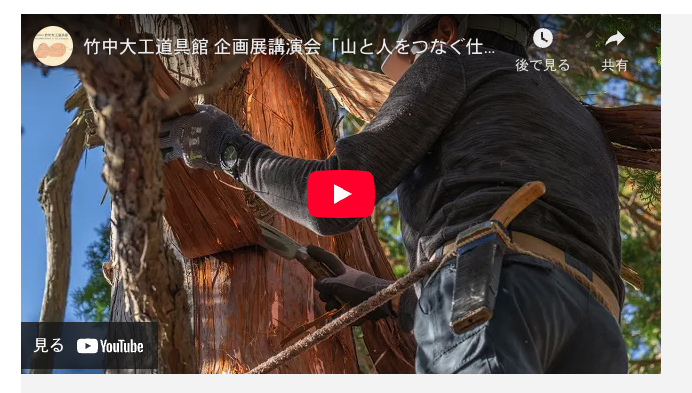 竹中大工道具館 企画展講演会「山と人をつなぐ仕事─原皮師が語る、檜皮採取の世界/Connecting Mountains and People: The World of Hinoki(youtube/竹中大工道具館)