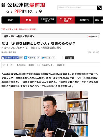 まちづくり岩手県紫波町のオガールプロジェクトの構想を描いた中心人物という、オガールプラザおよびオガールベース代表取締役の岡崎正信氏にインタビューしている記事が、公民連携最前線 PPPまちづくりに掲載されています。