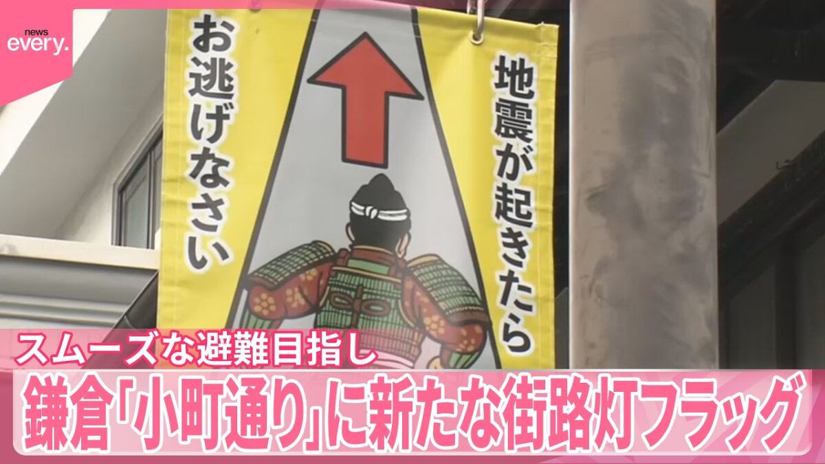 【お逃げなさい】鎌倉武士が津波避難の目印に…鎌倉「小町通り」に新たな街路灯フラッグ、観光客らのスムーズな避難目指し(youtube/日テレNEWS)