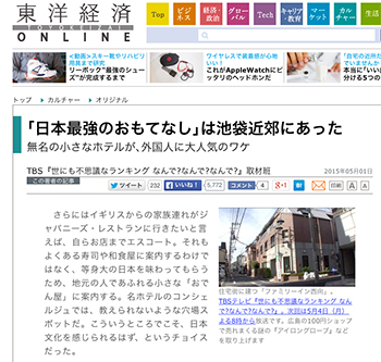 アラカルト「「日本最強のおもてなし」は池袋近郊にあった 無名の小さなホテルが、外国人に大人気のワケ」というTBS『世にも不思議なランキング なんで?なんで?なんで?』取材班による記事が、東洋経済オンラインに掲載されています。