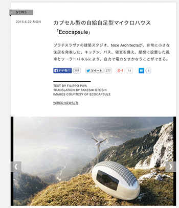 住宅ブラチスラヴァの建築スタジオ、Nice Architectsによる、キッチン、バス、寝室を備え、屋根に設置した風車とソーラーパネルにより、自力で電力をまかなうことができるマイクロハウス「Ecosapsule」を紹介している記事がWIRED.jpに掲載されています。