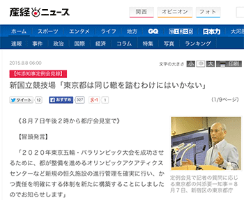 新国立競技場問題に関する記事「新国立「新国立競技場「東京都は同じ轍を踏むわけにはいかない」【舛添知事定例会見録】」が、産経ニュースに掲載されています。