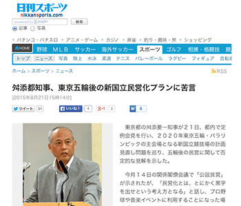 ジャーナル新国立競技場に関する記事「舛添都知事、東京五輪後の新国立民営化プランに苦言」が、日刊スポーツに掲載されています。