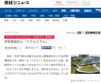 建築家の松岡恭子氏による記事「伊東豊雄氏と「ぐりんぐりん」」が、産経ニュースに掲載されています。