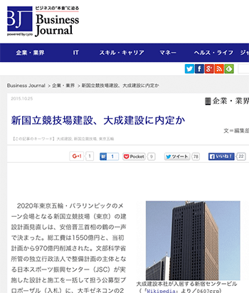 アラカルト「新国立競技場建設、大成建設に内定か 」という新国立競技場の整備に関する記事がビジネスジャーナルに掲載されています。