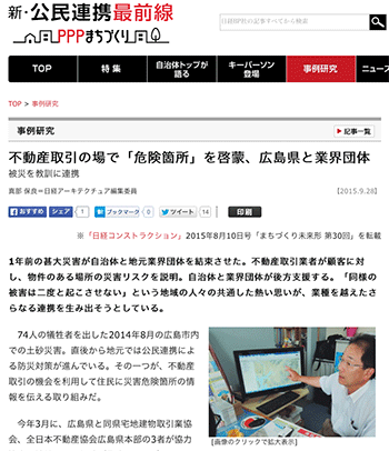 まちづくり「不動産取引の場で「危険箇所」を啓蒙、広島県と業界団体」という広島県での事例を紹介している記事が、新・公民連携最前線 PPPまちづくりに掲載されています。