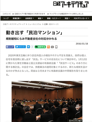 まちづくり「動き出す「民泊マンション」 規制緩和にらみ不動産会社の対応分かれる 」という民泊関連のニュースが日経アーキテクチュアに掲載されています。