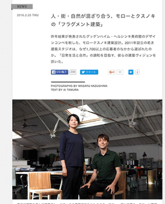 グッゲンハイム・ヘルシンキ美術館のデザインコンペを制した、モロークスノキ建築設計へのインタビュー記事「人・街・自然が混ざり合う、モローとクスノキの「フラグメント建築」」が、WIRED.jpに掲載されています。