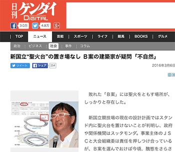 建築「新国立“聖火台”の置き場なし B案の建築家が疑問「不自然」」という新国立競技場の聖火台問題に関する記事が、日刊ゲンダイDIGITALに掲載されています。