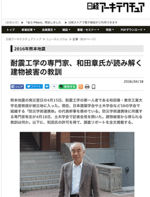 「耐震工学の専門家、和田章氏が読み解く建物被害の教訓」という熊本地震に関連した記事が、日経アーキテクチュアに掲載されています。