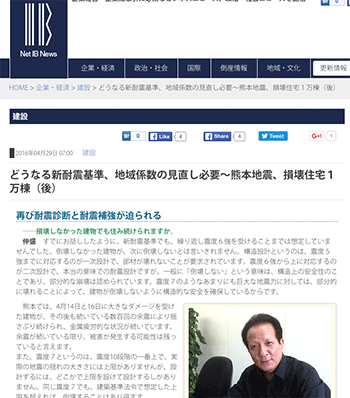 「どうなる新耐震基準、地域係数の見直し必要~熊本地震、損壊住宅1万棟 」という、構造設計一級建築士の仲盛昭二氏((株)九州構研取締役)に話を聞いている記事が、NETIB-NEWSに掲載されています。