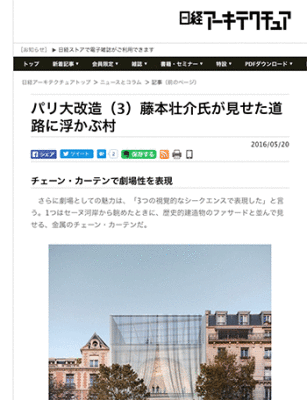 2015年にフランス、パリにて開催された国際コンペ「reinventer paris(リインベンター・パリ)」での、藤本壮介建築設計事務所+フランスの建築設計事務所Manal Rachdi OXOの計画案およびShigeru Ban Architects Europe(坂茂)による計画案を紹介している記事が、日経アーキテクチュアに掲載されています。