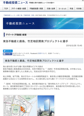 東急不動産と鹿島建設による「(仮称)竹芝地区開発計画」について取り上げている記事が、不動産投資ニュースに掲載されています。
