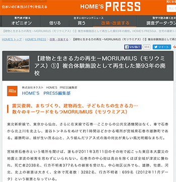 「【建物と生きる力の再生-MORIUMIUS(モリウミアス)①】複合体験施設として再生した築93年の廃校」という、石巻市雄勝町桑浜にできた複合体験施設モリウミアスのフィールドディレクターである油井元太郎さんに話をきいている記事が、HOME’S PRESSに掲載されています。