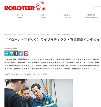 ロボット&ドローンライゾマティクスの石橋素氏へのインタビュー記事が、ROBOTEERに掲載されています。