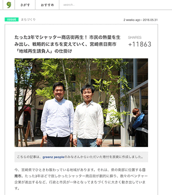 まちづくり「たった3年でシャッター商店街再生! 市民の熱量を生み出し、戦略的にまちを変えていく、宮崎県日南市「地域再生請負人」の仕掛け」という記事が、グリーンズに掲載されています。