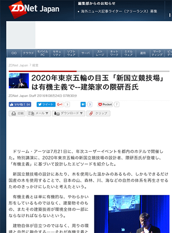 建築「2020年東京五輪の目玉「新国立競技場」は有機主義で–建築家の隈研吾氏」という、ドリーム・アーツのユーザーイベントにて登壇した隈研吾氏の講演内容をまとめている記事が、ZDNet Japanに掲載されています。