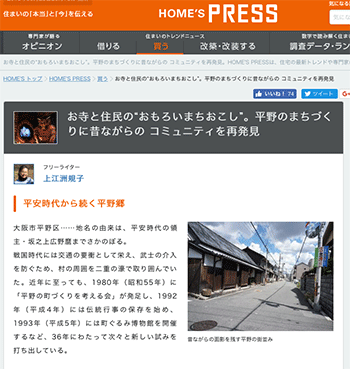 伝統建築とメディア「お寺と住民の“おもろいまちおこし”。平野のまちづくりに昔ながらの コミュニティを再発見」という大阪市平野区のまちづくりについて取り上げている記事が、HOME’S PRESSに掲載されています。