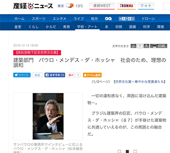 高松宮殿下記念世界文化賞を受賞したブラジルの建築家のパウロ・メンデス・ダ・ホッシャ氏の活動を紹介している記事が、 産経ニュースに掲載されています。