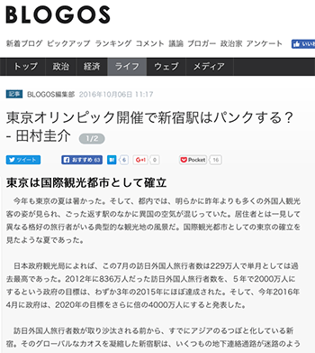 スポンサーリンク 東京オリンピック開催で新宿駅はパンクする? /田村圭介 (BLOGOS) まちづくり 2016.11.012025.11.19 「東京オリンピック開催で新宿駅はパンクする?」という田村圭介氏による記事が、BLOGOSに掲載されています。 →『東京オリンピック開催で新宿駅はパンクする? 』 http://blogos.com/article/192991/