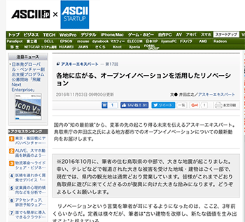 「各地に広がる、オープンイノベーションを活用したリノベーション」という鳥取県庁の井田広之氏によるレポート記事が、ASCII.jpに掲載されています。