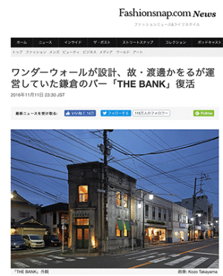 片山正通が主宰するワンダーウォールが、鎌倉に再オープンしたバー「ザ・バンク(THE BANK)」のインテリアデザインを担当し、アートディレクターの渡邊かをる氏が生前運営していたバーの建物や内装、家具などを当時の状態に近い形に復元し、近日中にオープンする予定だそうです。
