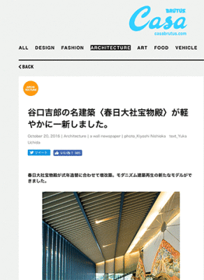 まちづくり式年造替に合わせて増改築された春日大社宝物殿について取り上げている記事が、カーサ ブルータスに掲載されています。