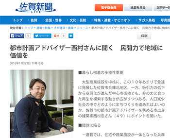 再開発「都市計画アドバイザー西村さんに聞く 民間力で地域に価値を」という建築家の西村浩さんに話をきいている記事が、佐賀新聞LiVEに掲載されています。