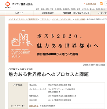 2016年10月18日に「ポスト2020、魅力ある世界都市へ - 訪日客数4000万人時代への挑戦 -」(登壇者(青山 佾氏/明治大学公共政策大学院 教授、イェスパー・コール氏/ウィズダムツリージャパン株式会社最高経営責任者、牧野 知弘氏/オラガ総研株式会 代表取締役社長、吉本光宏/ニッセイ基礎研究所 研究理事、加藤 えり子/不動産運用調査室長))をテーマに開催されたニッセイ基礎研シンポジウムの内容をレポートしている記事が、ニッセイ基礎研究所に掲載されています。