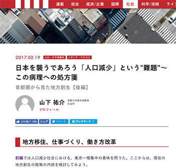 山下祐介氏による記事「多くの日本人が知らない「人口減少」と「東京一極集中」本当の意味」or「日本を襲うであろう「人口減少」という”難題”〜この病理への処方箋 」が、講談社に掲載されています。
