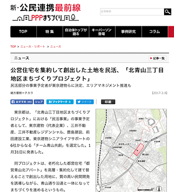 まちづくり「北青山三丁目地区まちづくりプロジェクト」における「民活事業」の事業予定者などの決定ニュースなどを取り上げている記事が、新・公民連携最前線 PPPまちづくりに掲載されています。
