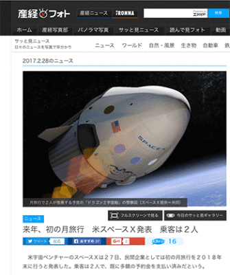 アメリカの宇宙ベンチャーのスペースXが先月発表した、民間企業としては初の月旅行を2018年末に行うことについてのニュースを取り上げている記事が、産経フォトに掲載されています。