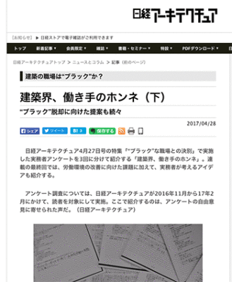 日経アーキテクチュア4月27日号にて掲載された特集テーマ「“ブラック”な職場との決別」の関連内容の記事が、日経アーキテクチュアに掲載されています。