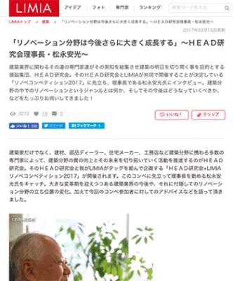 「「リノベーション分野は今後さらに大きく成長する」〜HEAD研究会理事長・松永安光〜」という松永安光氏に話を聞いている記事が、LIMIAに掲載されています。