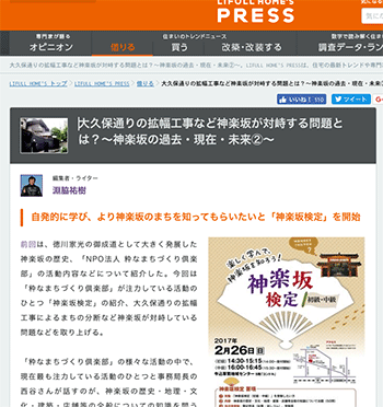東京、神楽坂の粋なまちづくり倶楽部の活動などについて取り上げている記事「神楽坂、「粋」という言葉が似合う”まちをつくる”取り組み」および「大久保通りの拡幅工事など神楽坂が対峙する問題とは?」が、LIFULL HOME’S PRESSに掲載されています。