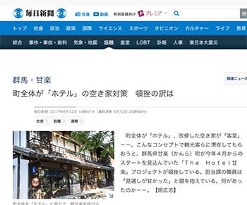 「町全体が「ホテル」の空き家対策 頓挫の訳は」という群馬県甘楽町の「The Hotel甘楽」プロジェクトについて取り上げている記事が、毎日新聞に掲載されています。