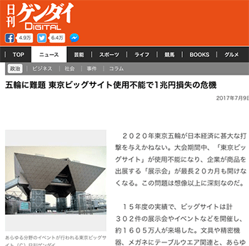 都市イベント・構想「五輪に難題 東京ビッグサイト使用不能で1兆円損失の危機」という記事が、日刊ゲンダイDIGITALに掲載されています。