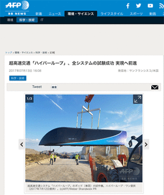 アメリカのハイパーループ・ワン(Hyperloop One)による超高速交通システム「ハイパーループ」について取り上げている記事が、AFPBB Newsに掲載されています。