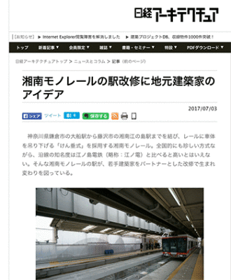 「湘南モノレールの駅改修に地元建築家のアイデア」という2017年3月に実施した湘南モノレール富士見町駅の改修工事プロジェクトについて取り上げている記事が、日経アーキテクチュアに掲載されています。