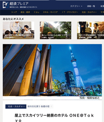 「屋上でスカイツリー絶景のホテル ONE@Tokyo」という稲葉なおと氏による記事が、毎日新聞「経済プレミア」に掲載されています。