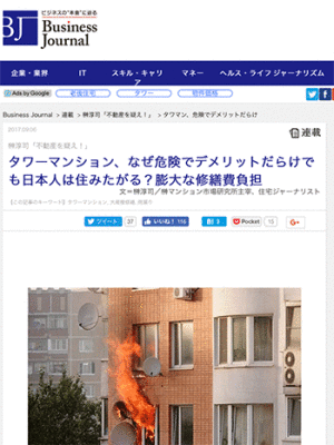 都市とメディア「タワーマンション、なぜ危険でデメリットだらけでも日本人は住みたがる?膨大な修繕費負担」という榊淳司氏による記事がビジネスジャーナルに掲載されています。