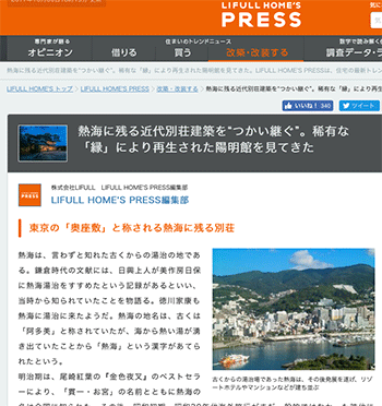 リノベーション・空間再生「熱海に残る近代別荘建築を“つかい継ぐ”。稀有な「縁」により再生された陽明館を見てきた」というブルースタジオによってリノベーションされた熱海「陽明館」について取り上げている記事が、LIFULL HOME’S PRESSに掲載されています。