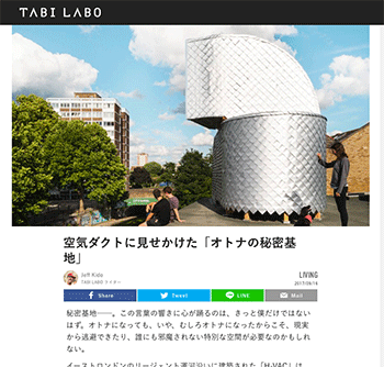 「空気ダクトに見せかけた「オトナの秘密基地」」というイーストロンドンのリージェント運河沿いに建築された「H-VAC」について取り上げている記事が、TABI LABOに掲載されています。