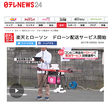 「楽天とローソン ドローン配送サービス開始」という楽天とローソンが共同で「ドローン」を使ったコンビニの商品配送サービスを福島県南相馬市で今月31日より始めるというニュースを取り上げている動画ニュースが、日テレNEWS24にて公開されています。