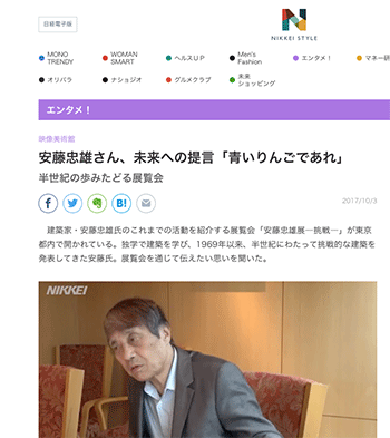 建築とメディア「安藤忠雄さん、未来への提言「青いりんごであれ」」という安藤忠雄氏に話を聞いている記事と動画がNIKKEI STYLEに掲載されています。